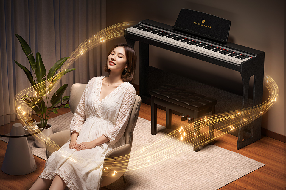 弹奏力度大时声音较强劲,弹奏力度小时声音会柔和媲美三角钢琴的演奏效果。 |